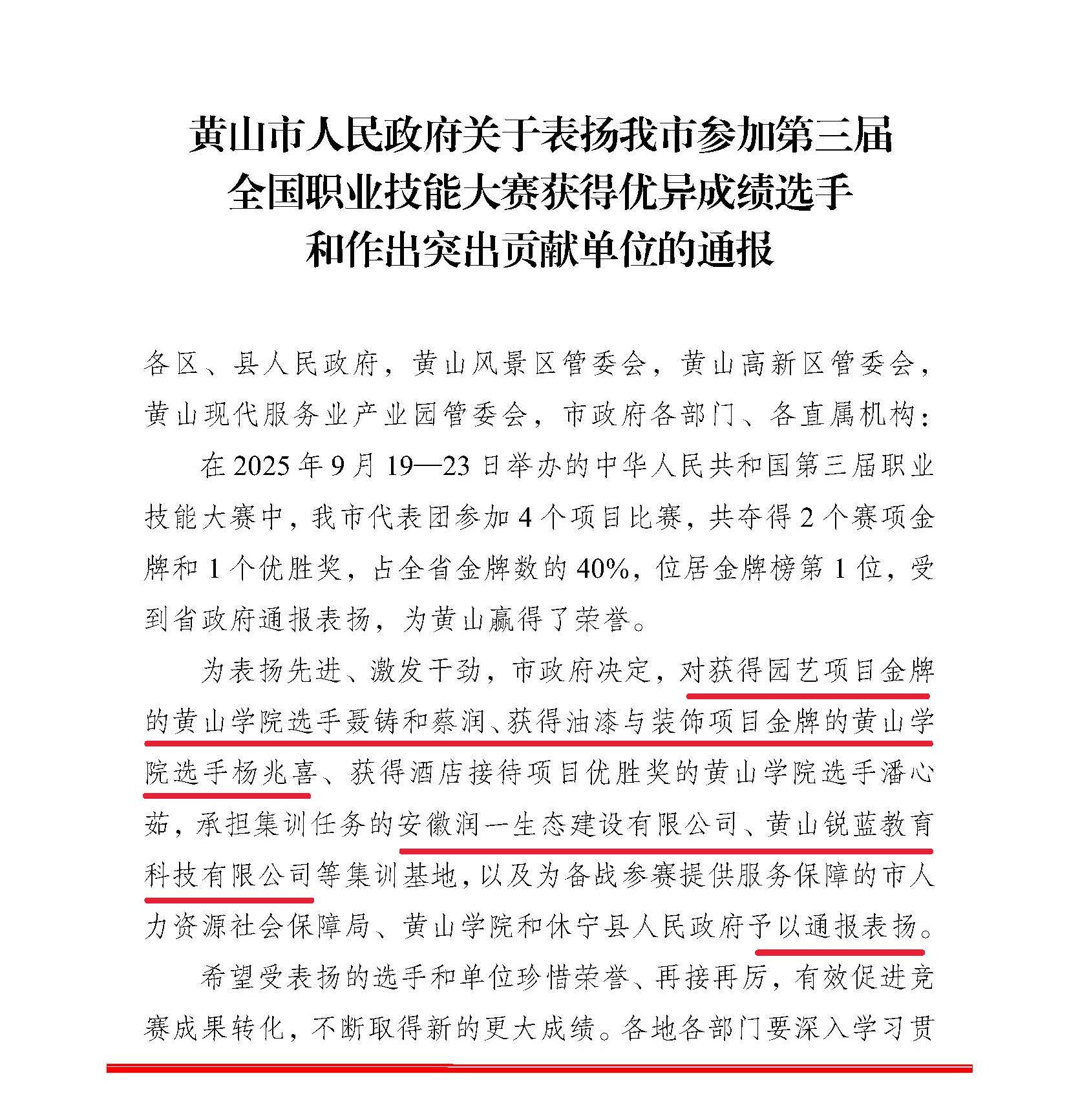 在第三届全国职业技能大赛中,由我公司承担集训任务的选手勇夺两枚金牌,为黄山市赢得荣誉。为此,黄山市人民政府特对我公司予以通报表扬。这是我公司在技能人才培养领域,继获得部、省级荣誉后,再次获得的重要认可。我们将珍惜荣誉,持续为培养高素质技能人才贡献力量。