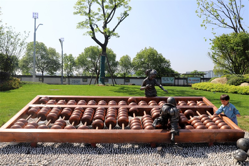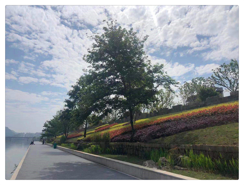 本项目最引人注目的是以滨江堤岸为慢行主轴,沿线设置不同颜色彩道以及有趣味性的驻足点、兴奋点,让游人行在其中,乐在其中,美在其中。率水桥下南侧,是健康步道入口。首先映入眼帘是体现“江南新城滨江绿道“主题的一组建筑小品,活泼、生动、形象,而地面的自行车发展简史介绍,制作工艺独具匠心,以激发运动爱好者的热情。滨江亲水跑道,路面由青灰色的透水混凝铺成,宽阔平坦,沿江一侧加装安全护栏,满足周边居民、运动休闲功能。是散步、垂钓者的首选,早晚行人比肩继踵,碧水、蓝天、白云、三江口、屯溪老街尽收眼底,美不胜收。沿岸的深红色绿道一直延伸至佩琅桥段,纵横交错的彩道与沿线的绿树花草、园林长廊以及雕塑交相辉映,形成了集环保、运动、休闲、旅游等功能于一体的滨江观光带。