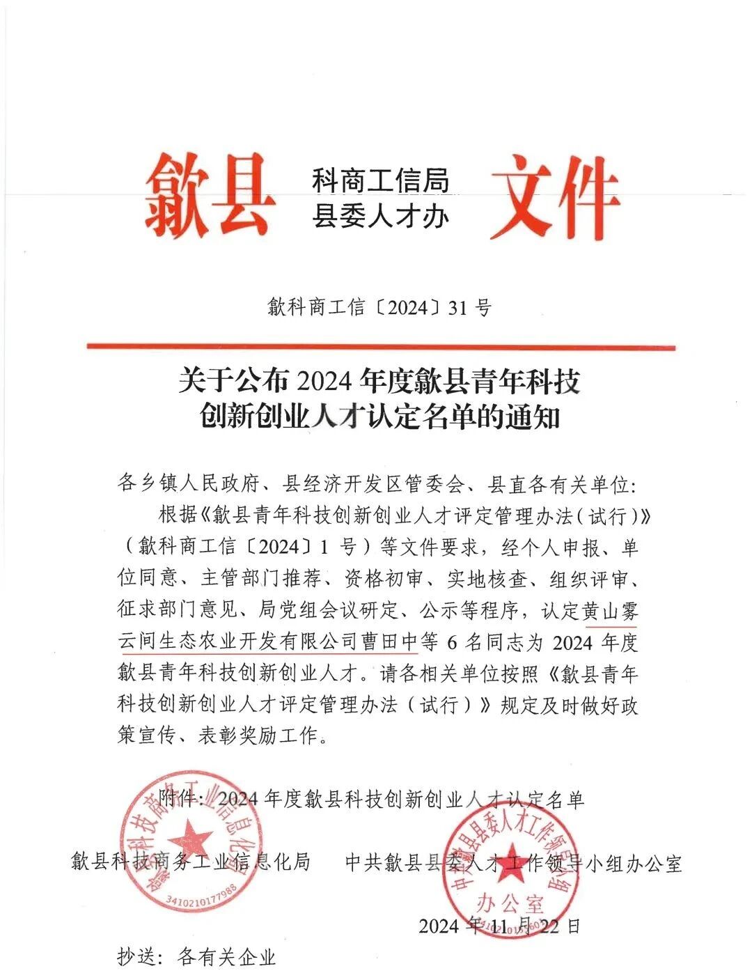 根据中共歙县县委人才工作领导小组办公室和歙县科学技术商务经济信息化局联合发布的《关于公布2024年度歙县青年科技创新创业人才认定名单的通知》,黄山雾云间生态农业开发有限公司总经理曹田中先生荣获2024年度歙县青年科技创新创业人才认定。黄山雾云间生态农业开发有限公司将继续加大科技创新,助力歙县珠兰花茶产业发展和乡村振兴。