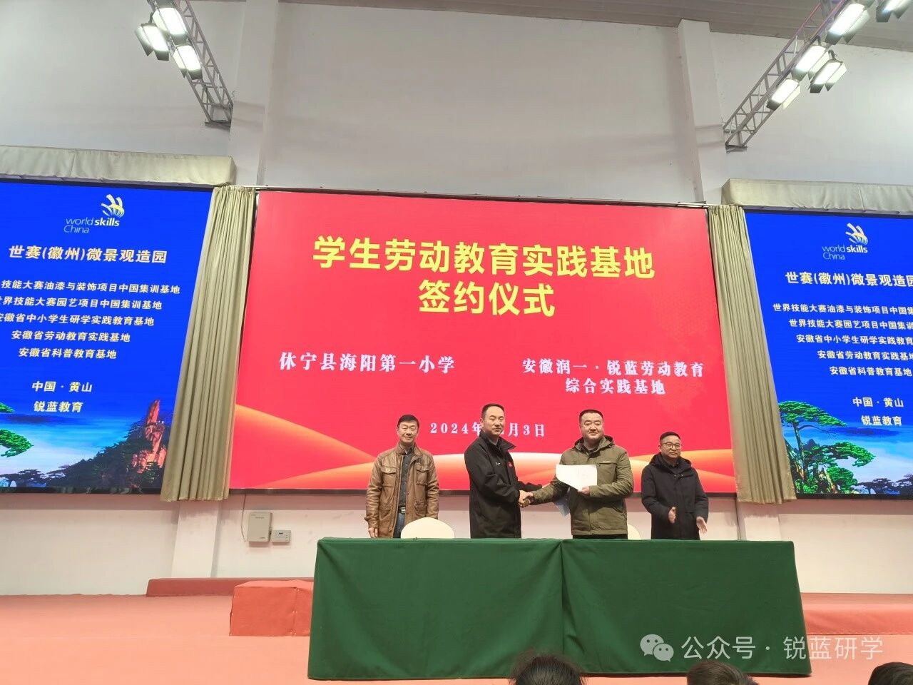 为深入贯彻党的教育方针,落实《教育部大中小学劳动教育指导纲要(试行)》《教育部义务教育劳动课程标准(2022年版)》《中共安徽省委安徽省人民政府关于全面加强新时代大中小学劳动教育的实施意见》文件精神,培养学生的劳动观念、劳动技能和创新精神,2024年12月3日上午,休宁县海阳第一小学五年级师生来我基地体验世赛《徽州微景观造园》劳动实践课程暨开展校外劳动实践基地的签约仪式。安徽润一锐蓝研学基地是安徽